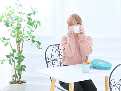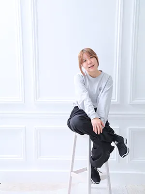 私が座っているのは、最近新しくスタジオにやってきたハイチェアです!